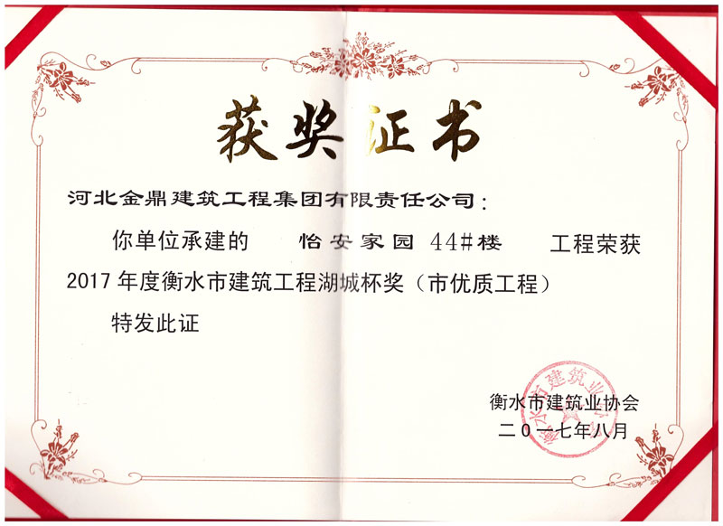 怡安家園44#樓工程榮獲2017年衡水市建筑工程湖城杯獎(市優質工程)