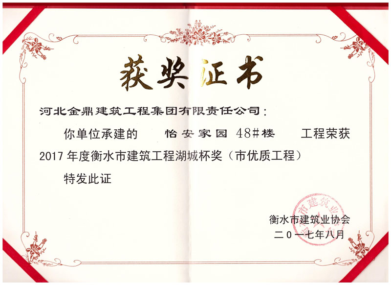 怡安家園48#樓工程榮獲2017年衡水市建筑工程湖城杯獎(市優質工程)